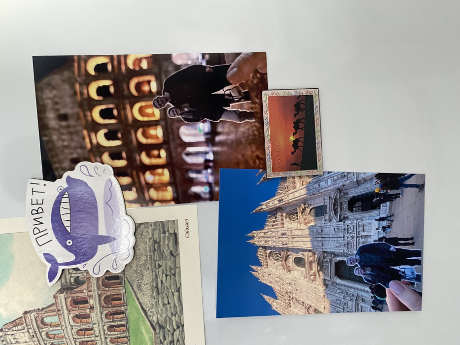 A collection of photographs and magnets is affixed to a plain white surface. In the upper left, a portion of an artistic print or postcard depicts the Colosseum in Rome, Italy, with the word "Colosseo" at its base. Overlaying this print and extending to the upper right is a photograph of the Colosseum in Rome, Italy, illuminated at night. Superimposed on this night scene is a cut-out image of a smiling man and woman, depicted from the waist up; a human finger holds this cut-out from below. A purple whale-shaped magnet, bearing the Russian word "ПРИВЕТ!" (Hello!), is also affixed to the upper left area, partially covering both the artistic print and the night photograph of the Colosseum. In the lower left, a vertical photograph displays the exterior of the Duomo di Milano in Milan, Italy, under a clear blue sky, with several individuals visible in the foreground near the building. Superimposed on this photograph is another cut-out image of the same smiling man and woman, depicted full-body; a human finger holds this cut-out from the left side. To the right of the Duomo photograph, a small rectangular magnet or postcard depicts a desert sunset scene with three silhouetted camels and a single human figure, identified by the text "EGYPT" in the upper left corner.
