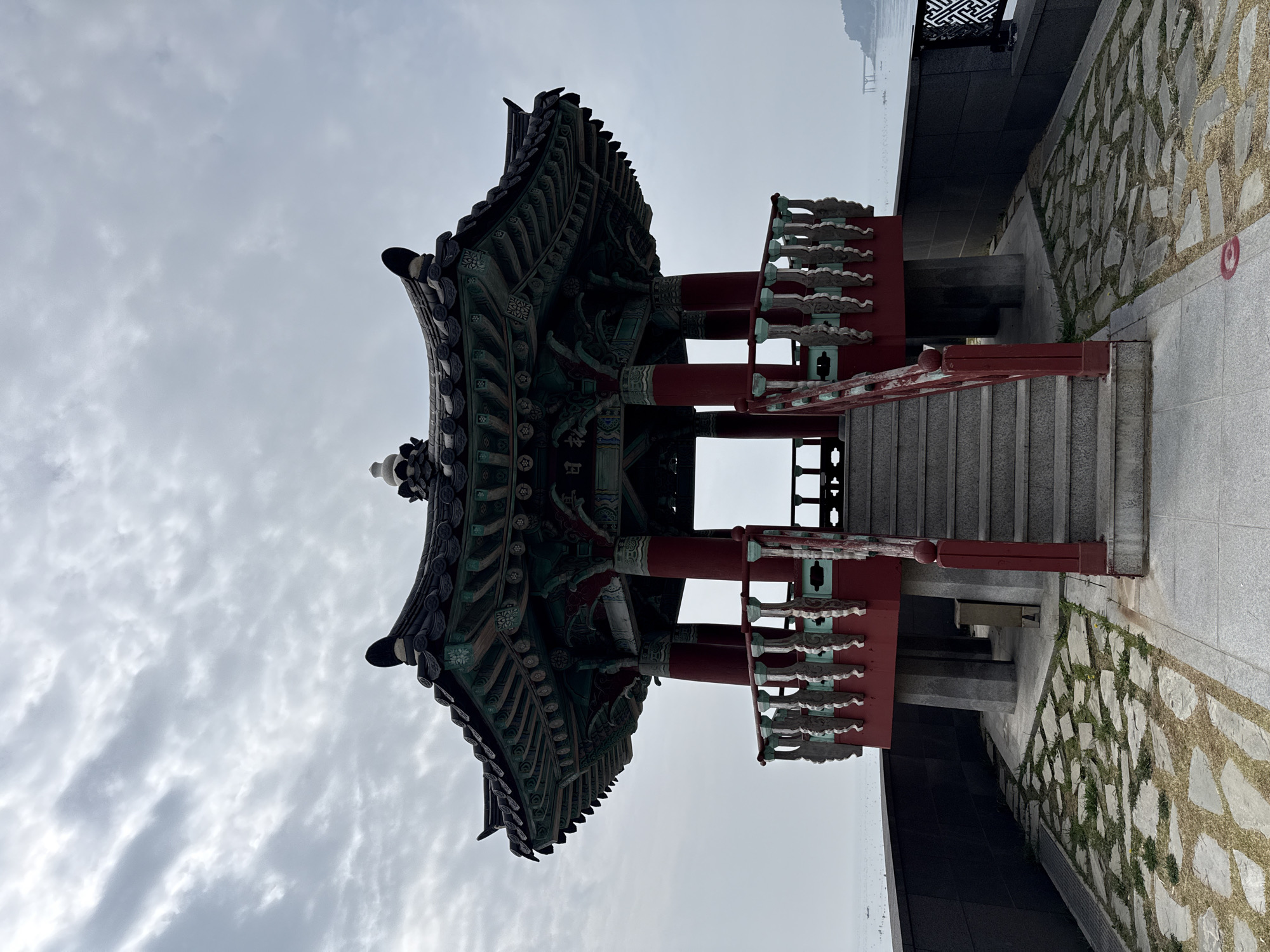 A low-angle, portrait-oriented photograph features a traditional Korean pavilion located in the city of Busan, South Korea. The pavilion's roof is intricately decorated with dark green, red, and black details, and has a distinct, upward-curving shape. A white ornamental top adorns the apex of the roof. The pavilion is supported by red pillars and features a red railing with decorative elements in light green and red. A set of gray stone steps leads up to the pavilion. To the right of the stairs is a path paved with irregularly shaped stones with patches of grass growing between them. A modern, dark gray wall extends on the same side. In the background, there is a body of water and a section of the city skyline is faintly visible. The sky is overcast with gray clouds. The photo appears to be taken during the day.