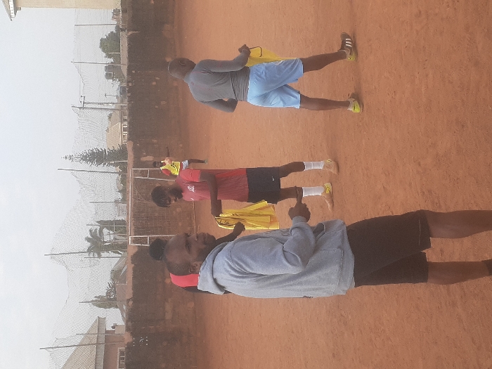 Three men stand on a red dirt surface. The closest man wears a light blue hooded sweatshirt and black shorts. Another man has on a red shirt and black shorts, while the furthest figure sports a gray long-sleeve shirt with blue shorts. All three men are facing away from the camera and appear to be holding yellow items, possibly shirts or towels, behind their backs. A tennis net and trees are visible in the background.