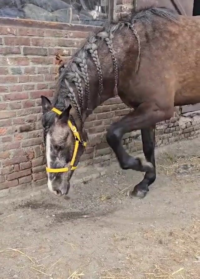 A brown horse with a white face and a yellow halter is standing near a brick wall and eating something off the ground. The horse has braids in its mane. In the background, there is a building with a door and a window. The ground is dirt with some straw scattered on it.