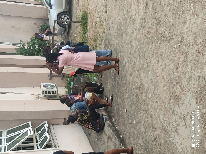 A group of people are outside a building with an air conditioner. Some individuals are seated, reading or looking down, while others stand. A woman in a light pink dress stands near a person in blue denim clothing. A car is parked in the background near some foliage. The ground is concrete and appears to be outdoors.