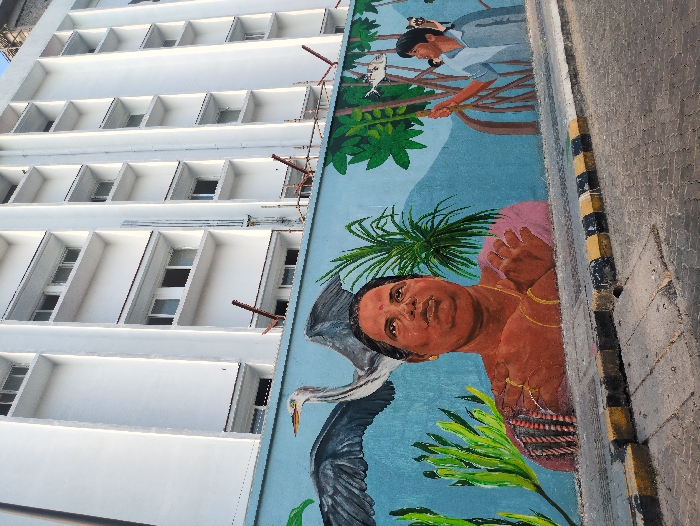 An outdoor scene in Kochi, India, displays a vibrant mural on a low wall in the foreground, positioned below a multi-story white building