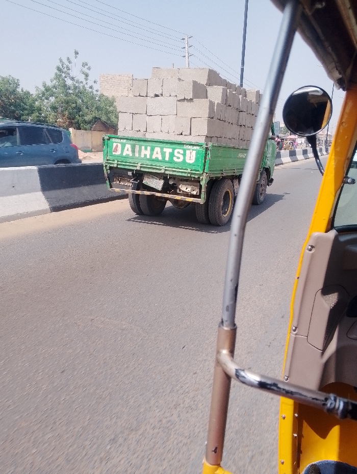 The scene is set on a paved road in Chiranchi, Nigeria, under a clear, bright sky. A green Daihatsu flatbed truck, oriented away from the viewer, occupies the central portion of the frame, moving forward. Its cargo bed is heavily loaded with approximately 70-80 grey concrete hollow blocks, stacked high above the truck's side rails. The word "DAIHATSU" is prominently displayed in white capital letters across the truck's green tailgate. The truck features dual rear wheels on at least two visible axles. To the immediate left of the truck, a black and white concrete traffic barrier separates lanes, behind which a dark blue SUV is partially visible, also in motion. The image is captured from the interior perspective of a yellow motorized tricycle (likely a "keke napep"), with a vertical metal support bar and a circular side mirror visible on the right side of the frame. In the background, beyond the road and vehicles, green trees are visible, along with a building constructed from light-colored concrete blocks and multiple utility poles with overhead power lines.