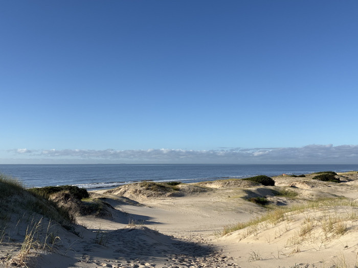 The image presents a wide view of a coastal dune landscape in Ciudad de la Costa, Uruguay, under clear skies