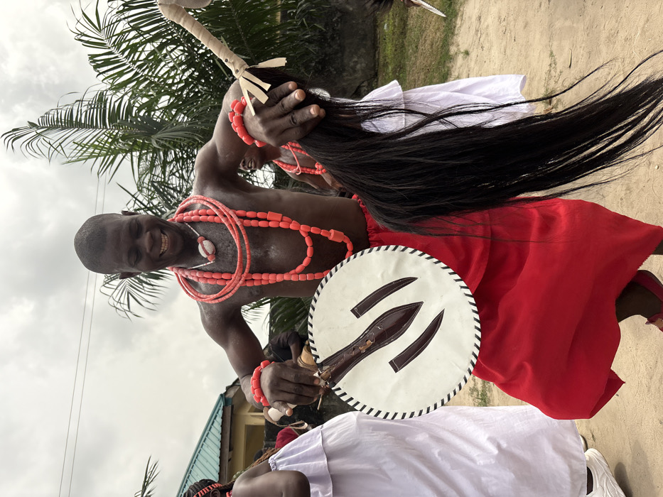 A dark-skinned adult male is depicted bare-chested, smiling broadly with teeth visible. He wears multiple strands of red coral beads around his neck and wrists, including a prominent necklace with a red and white circular pendant. A red fabric wraps around his lower body, resembling a skirt. In his left hand, he holds a circular white shield featuring a black zigzag pattern along its rim and three dark, stylized, spear-like shapes arranged vertically on its surface, with a dark wooden grip visible. His right hand holds a light-colored, possibly fabric-wrapped handle or staff from which a long, thick bundle of black hair or fibers hangs downwards, characteristic of a traditional whisk. He is positioned in a dynamic pose with outstretched arms, suggesting movement or dance. To his left, a person is partially visible wearing a white, off-the-shoulder garment and braided dark hair. In the mid-background, another individual is partially visible. The scene unfolds outdoors on light-colored dirt or sand. Green palm fronds are visible in the background, particularly on the right. A light-colored building with a green-tiled roof is visible in the left background. The sky is overcast. The event takes place in Agbarha-Otor, Nigeria.