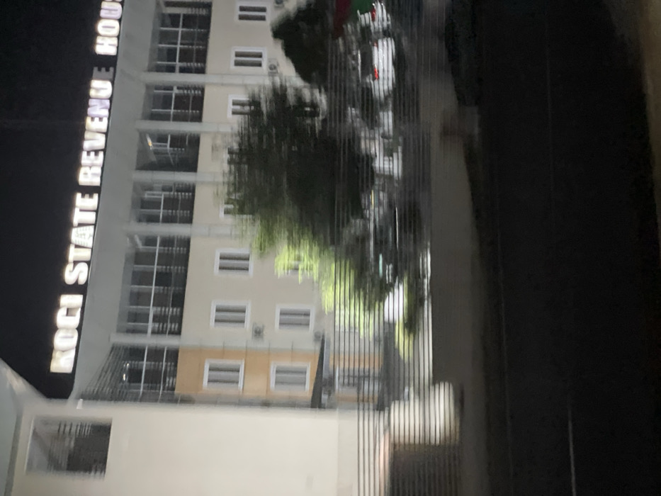 A multi-story building with rows of rectangular windows, a light-colored facade, and balconies is visible at night. Illuminated signage reads "Kogi State Revenue House." A dark, leafy tree partially obscures the view of the building, and a fenced barrier is in the foreground. The image is taken from inside, as part of the window or door is captured in the right side of the frame.