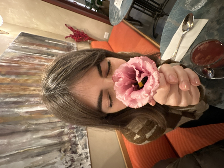 An individual, appearing to be a young adult female with light brown hair and bangs, is centered in the frame, visible from the mid-chest upwards. Her eyes are closed as she holds a single, large, vibrant pink flower, likely a Lisianthus, directly to her nose, inhaling its scent. She wears a brown sweater with a cream-colored geometric pattern. Her fingernails have a light, neutral polish. The scene is indoors, consistent with a cafe or restaurant. To the left, an orange, horizontally ribbed upholstered bench or booth seating is visible along a wall. The wall behind the person features a large, rectangular abstract painting with vertical streaks in muted tones of white, grey, brown, and light orange. The wall to the right is light cream or beige, with a textured finish. A small arrangement of red, spiky decorative branches is mounted on this wall. On a dark, possibly marble-topped round table to the right, a clear glass cup containing a dark reddish-brown liquid (likely a hot beverage) is present, with a small spoon immersed. A silver-colored spoon rests on a folded white paper napkin beside the cup. The presence of these items suggests the person is seated at the table. An adjacent dark jacket or clothing from another person is partially visible at the extreme lower left. The image does not contain specific visual identifiers to pinpoint the precise location within Tel-Aviv, Israel.
