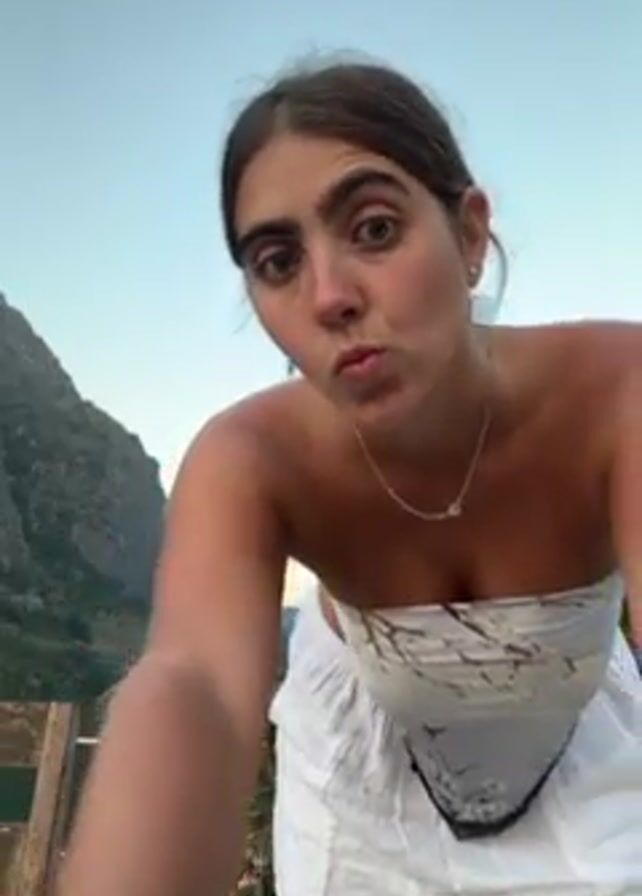 woman standing on a patio or balcony with a mountain in the background. The sky is blue, and it appears to be early evening. She is wearing a white scarf tied as a strapless top and white linen pants. The camera is positioned at a low angle, looking up at her. She poses briefly, looking at the camera. There is a wooden railing, a red rooftop, and some vegetation visible in the background. A bottle is seen on the patio.