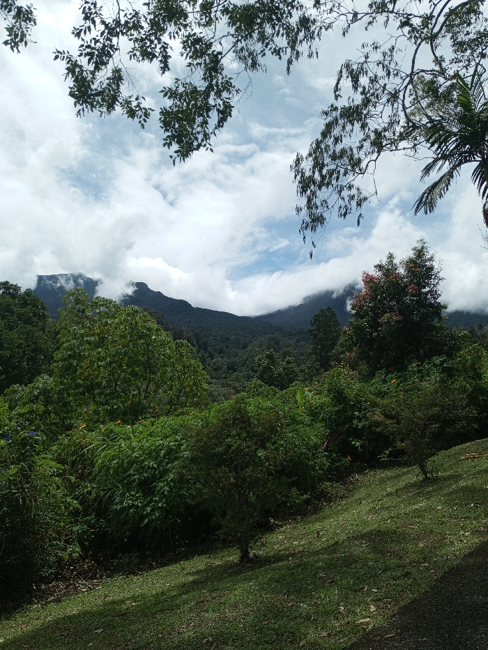 The image displays a densely vegetated, mountainous landscape located in the city of Bijanwada, India. The foreground features a grassy slope, partially covered in shadow, with scattered dry leaves on the ground. Several small, leafy bushes are present on this slope. The midground is dominated by a thick, varied canopy of numerous green trees and shrubs, exhibiting diverse leaf shapes and shades of green. One tree on the right side of the midground canopy displays reddish-pink foliage. The background consists of large, steep mountains, heavily covered in dark green forest, with their upper sections and peaks partially obscured by white and grey clouds or mist. The sky above is partly visible, showing areas of light blue sky interspersed with significant white cumulus clouds. Overhanging branches with dark green leaves are visible in the upper left and right corners of the frame. No human subjects, animals, or artificial structures are visible.