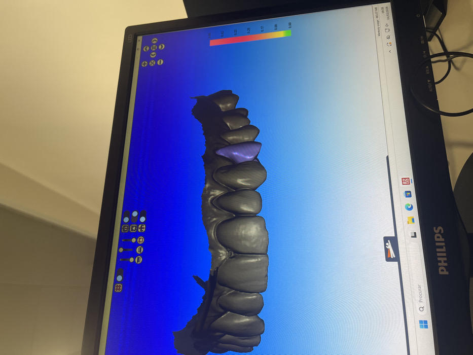 A Philips brand computer monitor is prominently displayed in an indoor setting in Gandra, Portugal. The monitor's screen shows dental computer-aided design (CAD) software with a 3D digital model of a human upper dental arch rendered in dark gray. One specific tooth, positioned on the right side of the arch, is highlighted in light purple. The software interface includes various control icons at the top of the screen: a series of circular and rectangular buttons on the left, and a vertical color gradient scale (red to green, ranging from 0.00 to 0.40) with associated icons on the right. The Windows taskbar is visible at the bottom, displaying "Procurar" (Search) and several application icons, including one labeled "B2". The system tray in the lower right corner indicates "Memory usage: 593.07 MB" and the date "04/03/2026" at "09:39". Dark cables are visible behind the monitor, which is positioned against a plain, light-colored wall.
