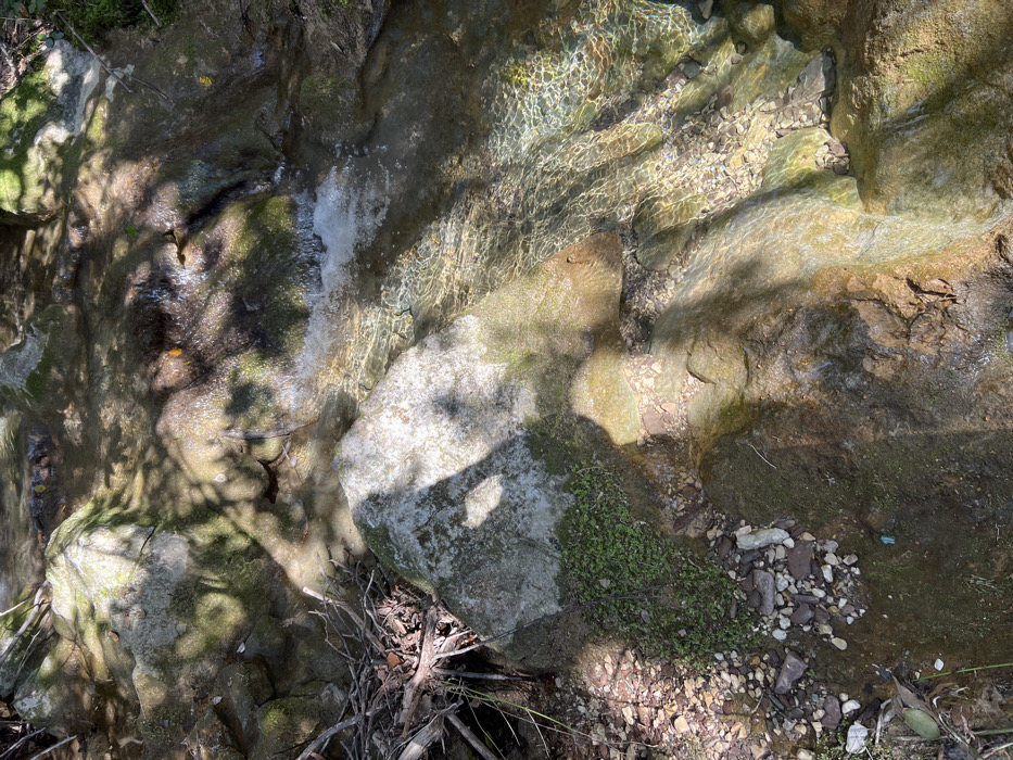 The image displays a clear, shallow stream or small cascade flowing over numerous rocks within a natural, vegetated environment in Ivanovići, Montenegro. Water, characterized by visible ripples and reflections of sunlight, courses from the upper portion of the frame downwards and to the right, creating small areas of foam where it tumbles over natural ledges. The stream bed and banks are composed of light-colored, greyish rocks of various sizes, many partially covered with green moss or algae. A large, prominent, smooth grey boulder partially covered in small green plants is positioned in the lower-left quadrant of the frame, bordering the water. Dried twigs and natural debris are visible on the left bank. Sunlight filters through an unseen canopy, casting dappled patterns of light and distinct shadows across the rocks and water. No human subjects or man-made structures are present.