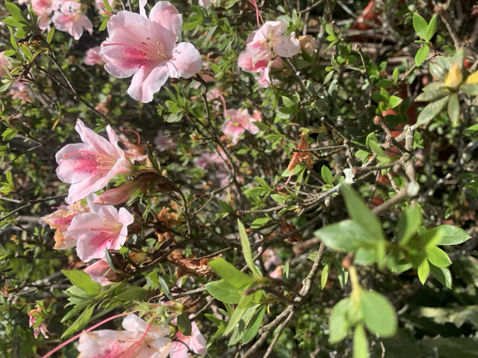 The image displays a detailed, close-up view of an azalea bush located in San Bernardino Tlaxcalancingo, Mexico. The bush is densely populated with numerous pale pink azalea flowers in various stages of bloom. Each flower exhibits five petals with distinctive dark pink or reddish-brown speckled patterns on the upper petals, and prominent stamens extending from the center. Several flowers are fully open, while others are visible as developing buds or partially withered blooms showing brown discoloration. The plant's foliage consists of an abundance of small, ovate green leaves, some appearing vibrant and healthy, others exhibiting signs of drying or browning. A complex network of thin, woody branches and twigs is visible throughout the frame. The scene is illuminated by natural sunlight, creating areas of highlight and shadow across the plant's surface. No human figures, animals, or man-made objects are discernible within the frame.