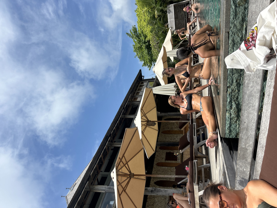 This image depicts an outdoor swimming pool area at a resort in Uluwatu, Indonesia, under a clear blue sky with scattered white clouds. In the immediate foreground, a woman wearing sunglasses and a dark green strapless top is partially visible on the left, seated on a brown cushioned sun lounger. To her right, a white towel with a colorful graphic design (featuring red, yellow, and pink shapes, including what appears to be "ROCK" text) is draped over a wooden beam. The mid-ground features a swimming pool with a greenish-tiled edge and a wooden deck. Three women in bikinis are positioned near the pool. On the wooden deck, a woman with long blonde hair, wearing a black halter-neck bikini top and patterned bottoms, sits with her legs extended towards the water. Next to her, two women are partially submerged in the pool water. One woman with light brown hair, wearing a black string bikini, is adjusting her top while looking towards the third woman, whose back is to the viewer, revealing dark braided hair and a dark bikini top. Behind these individuals, several brown cushioned sun loungers are arranged on the wooden deck, shaded by two large, open beige patio umbrellas. Further back on the left, another woman with dark hair and sunglasses, wearing an orange top, reclines on a sun lounger. Additional indistinct figures are visible on loungers and partially in the water towards the right side of the pool. The background is dominated by a multi-story building featuring a dark shingled roof, dark wooden facade elements, and a lower section with textured light-colored stone accents. Dense green tropical foliage and trees are visible on the right side of the frame, behind the pool and building.