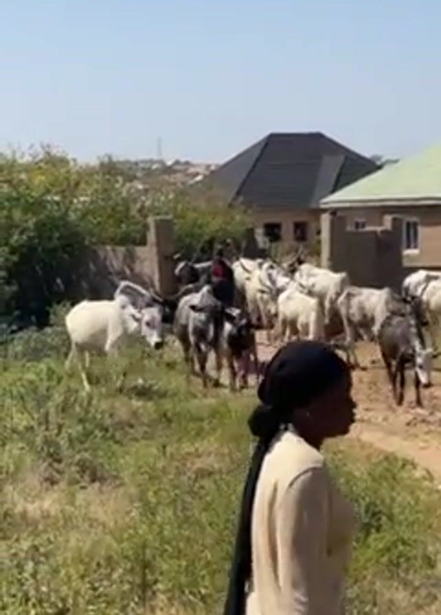A woman in a tan top and a black head covering walks on a dirt path. In the background, a herd of cattle moves down the path toward the viewer. There is a person on a motorcycle amongst the cattle. Green grass and a couple of buildings are on either side of the path. The sky is blue.