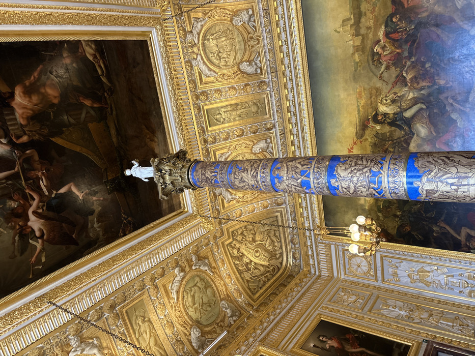 This image displays the opulent interior of a grand hall within the Palace of Versailles, France, specifically consistent with the Galerie des Batailles or an adjacent historical gallery. The perspective is an upward-angled shot. The elaborate ceiling is extensively gilded, featuring coffered sections with intricate gold relief sculptures depicting various figures and mythological or allegorical scenes, framed by ornate borders. A large central ceiling fresco portrays a dynamic scene with numerous figures, some partially nude, engaged in a dramatic narrative against a dark background. A prominent, tall, cylindrical column stands centrally in the frame. This column is primarily blue, adorned with spiraling gold-colored bas-reliefs that depict detailed historical or allegorical battle scenes featuring numerous figures. Atop the column's ornate capital, a small, white statue of a robed figure, possibly a classical deity or allegorical representation, is positioned. The walls are dominated by large-scale historical oil paintings. One prominent painting on the right depicts mounted soldiers in a chaotic battle scene, with a central figure on a white horse, likely a military commander, leading the charge. Other wall sections feature gilded architectural elements including pilasters and framed rectangular relief panels. A multi-armed, gold-colored chandelier with multiple globe-shaped lights hangs from the ceiling on the left side of the frame. No living individuals are visible in the scene, only figures depicted in the artwork.
