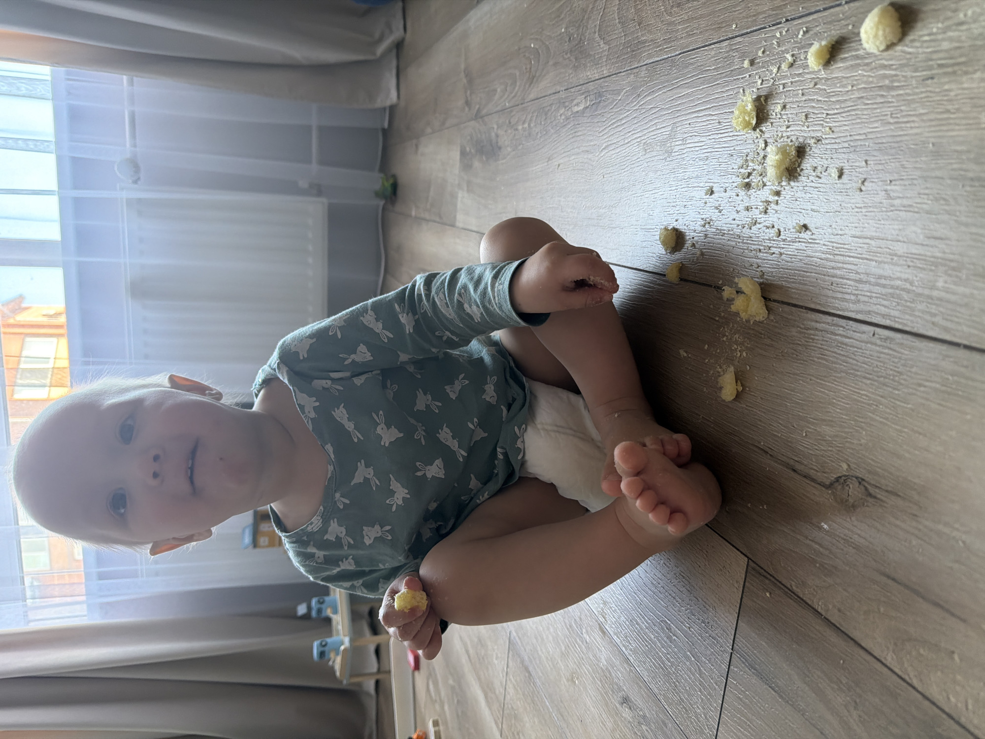 A toddler with light-colored hair is seated on a light brown wooden floor in an interior room in the city of Chaikovsky, Russia. The child wears a light green long-sleeved shirt with white rabbit patterns and a white diaper. Food residue is visible around the child's mouth. The right hand holds a piece of yellow, crumbly food. Scattered across the floor in front of and to the right of the child are multiple pieces and crumbs of the same yellow substance. In the background, a window is fitted with white sheer curtains and beige drapes, revealing an exterior view of an orange-brown building with white window frames. A white radiator is located beneath the window. To the left of the child, a small light-colored wooden table supports two blue objects, with an additional orange object partially visible on the floor further left.