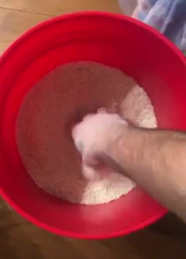 A person’s hand is stirring a bucket of rice. The hand is pale and a light growth of hair is visible on their forearm. The hand and forearm are above a large, red bucket filled with white, dry rice. The hand is moving about the bucket in a circular manner, disturbing the rice. The bucket sits on a wood floor. In the upper right is a small portion of a white and blue cloth. A length of dark blue tubing is visible at the bottom of the frame.