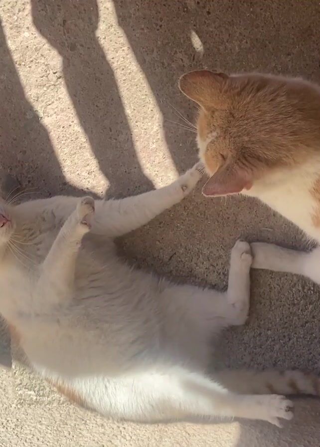 Two ginger and white cats are visible from an overhead angle. One cat is lying on its back, facing upwards, while the other cat is sitting next to it, looking down. The cats are on a concrete surface with shadows cast across it, likely from a nearby railing. The scene is well-lit, suggesting it is daytime.