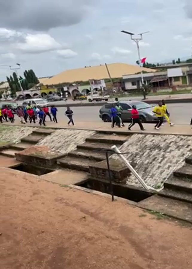 group of people marching along a road next to a raised concrete structure. The people, mostly wearing athletic clothing in colors like red, blue, green, and yellow, appear to be students. They are carrying what seem to be thin sticks or batons. The road is lined with cars and buildings, and a large, tan-colored building is visible in the background. The sky is overcast. The camera is stationary and captures the march from an elevated position.