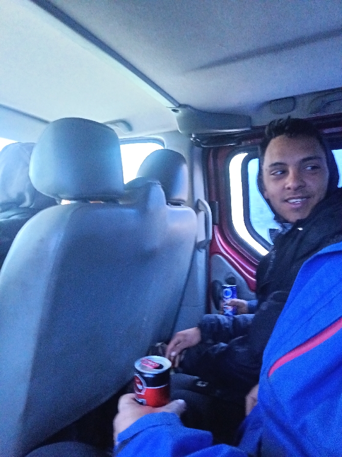 The scene depicts the interior of a multi-passenger vehicle, identified as being in Dzhurovo, Bulgaria. Three individuals are present within the vehicle. In the foreground, a left hand, wearing a blue jacket with a red stripe detail, holds an open red and black aluminum beverage can. To the left, the upper portion of a grey vehicle seat and headrest is visible, partially obscuring an occupant. To the right, a young adult male with dark hair, wearing a dark hooded jacket, is seated. He is looking towards the right side of the frame with a slight smile, and his right hand holds a blue and white aluminum beverage can against his leg. The vehicle's interior features a light-colored ceiling liner, grey synthetic seats, and a red door panel with a window on the right side, through which bright, undifferentiated daylight is visible.