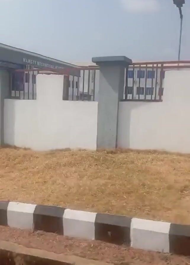 street scene. There is a sign for Majesty International College, Lokoja. A red arrow points right. A sign for RCCG, the Redeemed Christian Church of God, is also visible. The sky is light blue. The street is paved with grey bricks. There is grass and greenery. The video appears to be taken while moving.