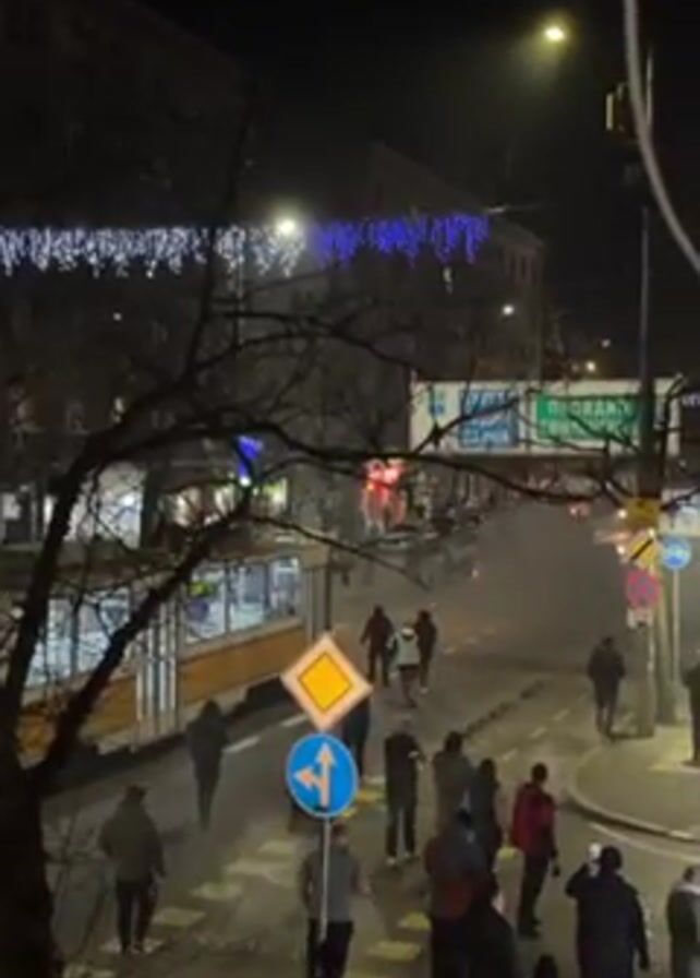 nighttime scene in an urban environment with a group of people gathered on a street. The people are mostly dressed in dark clothing, and some are moving around. A yellow and white tram is visible on the left side of the street. There is smoke in the air, possibly from fireworks or other pyrotechnics. Streetlights and Christmas lights provide illumination, and there are several traffic signs visible, including a diamond-shaped yellow sign and a blue directional sign. There is a street sign with Cyrillic text visible above the intersection.