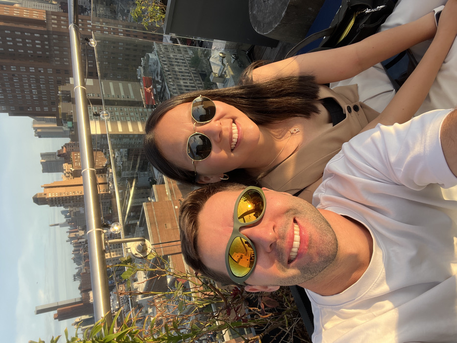 Two individuals, one male and one female, are seated on a rooftop terrace in New York City during golden hour, posing for a photograph