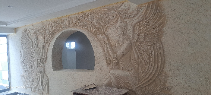 An interior view in Angren, Uzbekistan, depicts a section of a room featuring extensive bas-relief wall art. The light-colored wall, possibly textured plaster, is adorned with intricate sculptures of two winged, anthropomorphic figures in profile, facing inward towards a central arched opening. The figures, rendered in a cream or beige tone, appear to be in kneeling or seated positions, wearing ornate headwear and flowing garments. Elaborate floral and foliage motifs extend above and around the figures and the archway. A golden trim runs along the top edge of the decorated wall, meeting a white ceiling with a decorative cornice. To the left, a tall, vertical window with dark framing is partially visible. Through the central arched opening, a distant light source, possibly another window, is visible. In the foreground, a small, rectangular, light-colored table or workbench, dusted with fine particulate matter, holds a white tool, possibly a trowel or scraper. No individuals are present in the scene.