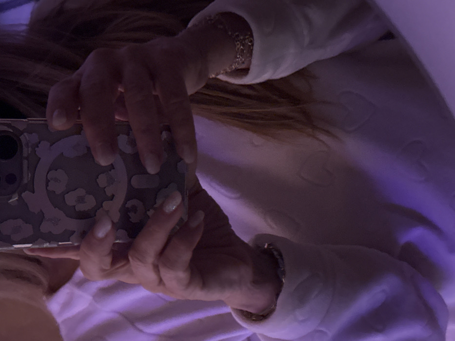 A selfie captures a person holding a smartphone with a patterned case, showcasing manicured hands. One wrist displays a bracelet. The individual is wearing a light-colored sweatshirt, subtly patterned with raised heart shapes. A soft, violet hue pervades the image, suggesting artificial lighting conditions. The subject is reflected in a mirror.