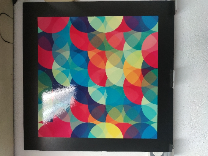 A framed artwork hangs on a white textured wall. The frame is black. The artwork features overlapping colorful circles creating vibrant hues. Red, blue, green, and yellow are dominant. The overlapping creates teal, orange, and purple tones. A bright reflection shines on the lower left corner of the artwork. The overall impression is a modern, geometric, and colorful piece.