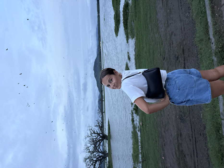 The scene depicts a female subject standing on a grassy bank bordering the Tissa Wewa in Thissamaharama, Sri Lanka, at dusk. The individual, appearing to be in her 20s or 30s, wears a white short-sleeved t-shirt, blue denim shorts, and gold-colored hoop earrings. A black shoulder bag hangs over her left shoulder. She poses with her left hand on her hip, body slightly turned to the left, and looks back over her left shoulder towards the camera with a faint smile. Behind the subject, the tranquil waters of the Tissa Wewa extend into the distance, with patches of green aquatic vegetation visible closer to the bank. On the far left side of the water, several large, distinctive trees with expansive, gnarled branches are positioned at the water's edge. Distant, low-lying hills are visible on the horizon. The sky is overcast, presenting a light blue-grey hue. Numerous small, dark silhouettes, identified as birds or bats, are visible in flight across the sky, particularly clustered in the upper left portion of the frame. The ambient light indicates twilight conditions.