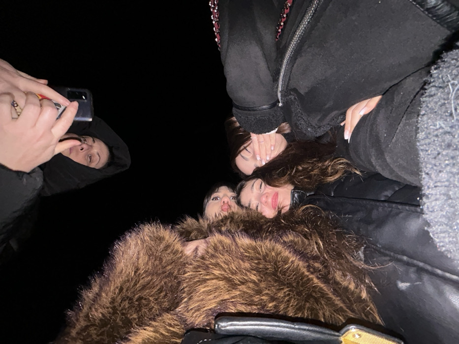 Four people huddle close in the dark, looking down at the camera. One person holds a phone, presumably taking the picture. A person in a dark hood is in the upper left, while three other people pose together. One wears a brown fur coat, another wears a black leather jacket, and the third wears a thick, dark jacket with faux fur lining. They appear to be outdoors at night.