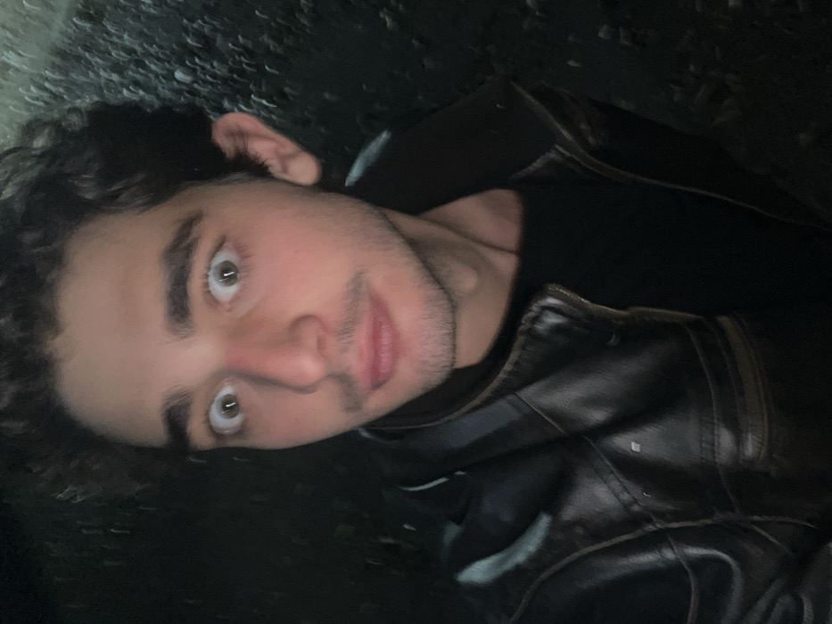 A young adult male is depicted in a close-up, frontal portrait, captured in Puebla City, Mexico. He has dark, curly hair, light-colored eyes dilated and wide open, and a slightly parted mouth. Light facial hair is present on his upper lip and chin. A reddish discoloration is observable on the bridge of his nose and cheeks. The individual wears a dark leather jacket over a dark shirt, with a thin dark cord visible at the base of his neck. The background is dark, out of focus, and features a textured, possibly reflective or wet surface on the right side. The scene is dimly lit, with primary illumination on the subject's face.