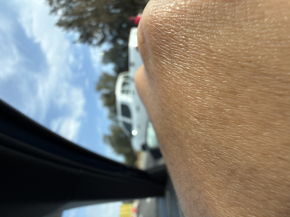 A close-up of tan skin reveals distinct pores and fine hairs. The scene is viewed through a car window, where a white truck, trees, and a partly cloudy sky are visible in the background. The car's window frame appears dark and out of focus. The overall perspective suggests the photo was taken from inside a vehicle.