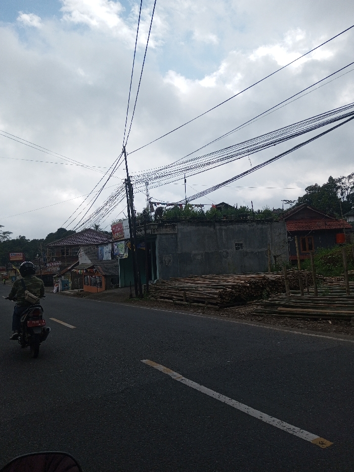 This image depicts a street scene in Ciherang, Indonesia, under an overcast sky with visible patches of blue. In the foreground, a dark asphalt road with a faded white and yellow dashed center line extends from the bottom of the frame towards the background. A single individual wearing a dark helmet and a camouflage-patterned jacket is operating a black motorcycle, traveling away from the viewer in the left lane. A light-colored bag is strapped to the rider's waist. To the right of the road, a substantial quantity of cut bamboo or slender timber logs is stacked horizontally on the ground in multiple piles. Behind these stacks, there is a gray, unrendered concrete building with a flat roof, featuring a small, square, recessed opening on its facade. To the right of this concrete structure, a smaller, dark-colored house with a red-tiled roof and visible wooden window frames is partially obscured by vegetation. On the left side of the road, a series of diverse commercial and residential buildings are visible, some with corrugated metal or tiled roofs. Signs, including one partially visible red sign with white text, are attached to some structures. Overlooking the street, a dense cluster of overhead utility lines and cables is suspended from multiple utility poles, creating a complex network across the upper mid-ground of the image. The horizon in the background reveals distant hills covered with dense foliage under the same cloudy sky.