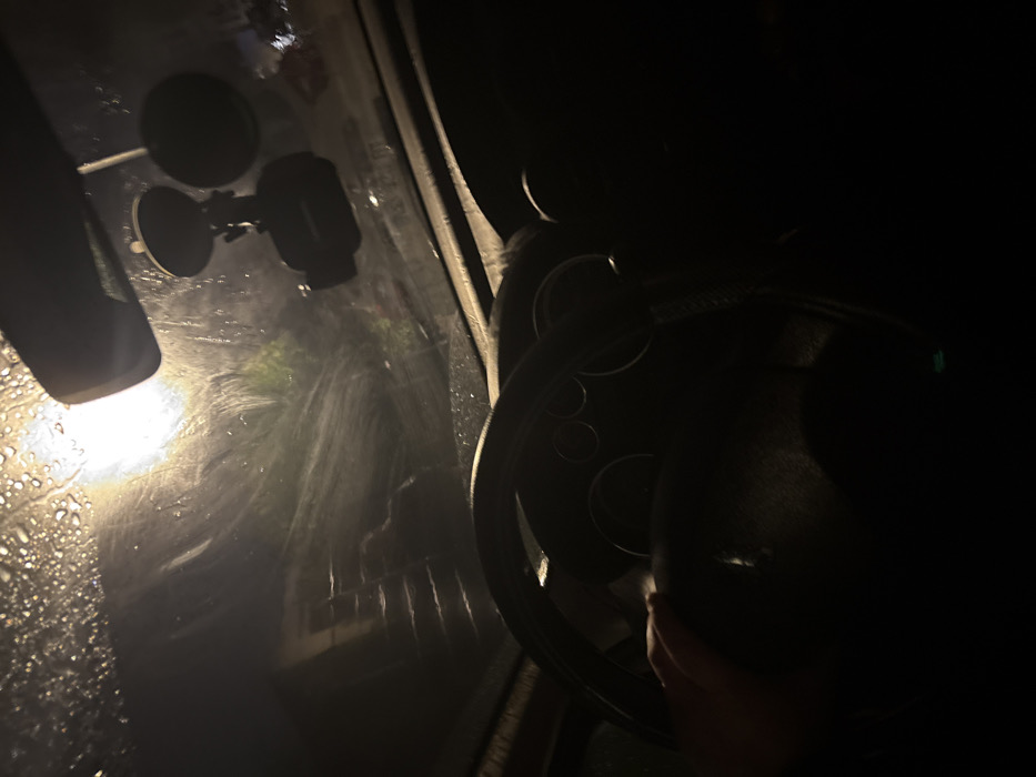 Rain streaks down a car windshield at night, illuminated by a bright streetlight outside. Inside, a dashboard mount with suction cups adheres to the glass. The steering wheel is visible in the darkness of the interior, partly obscured by what appears to be a person's face. The overall scene is dimly lit, dominated by darkness and the reflections of rain and light on the glass.