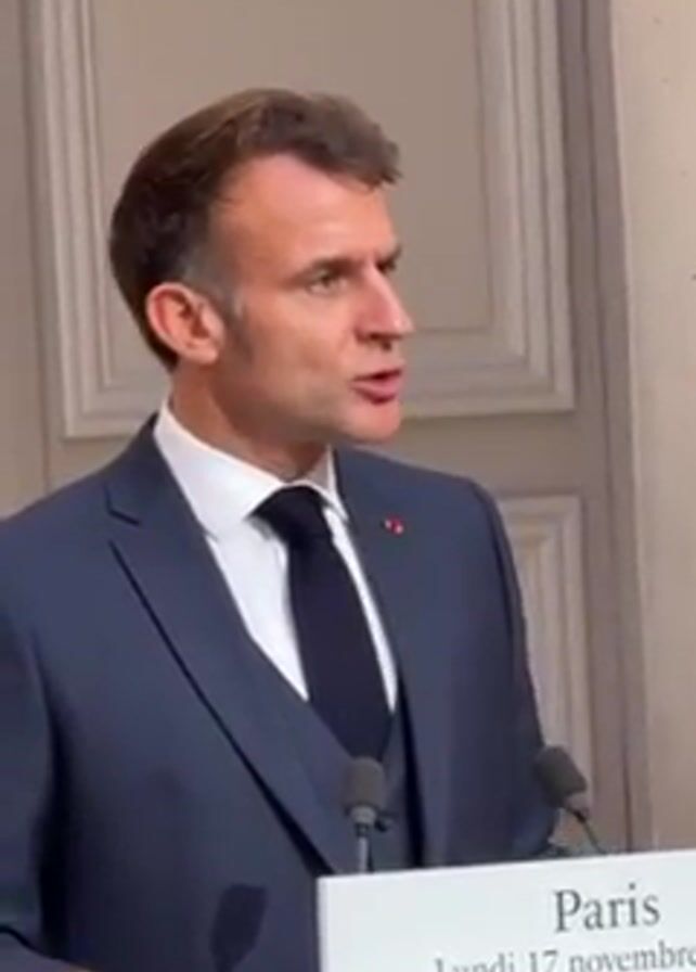 A man in a blue suit, a white shirt and a navy tie is speaking behind a podium. The podium has the words "Paris Lundi 17 novembre 20" written on it. The background is a wall with white paneling. There are two microphones in front of the man. He is speaking and gesturing with his hands.