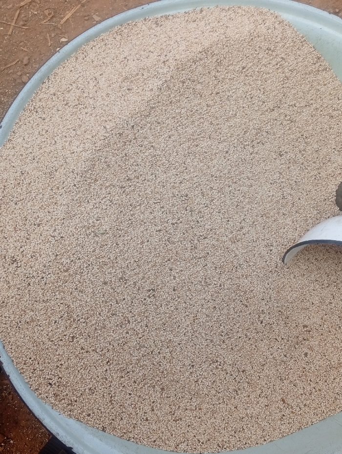 - "A large, light blue-grey circular metal basin, approximately 60-70 cm in diameter, is filled with a uniform layer of light brown to beige granular material, consistent with sesame seeds" by FM-xL0Ov1, licensed under CC BY 4.0