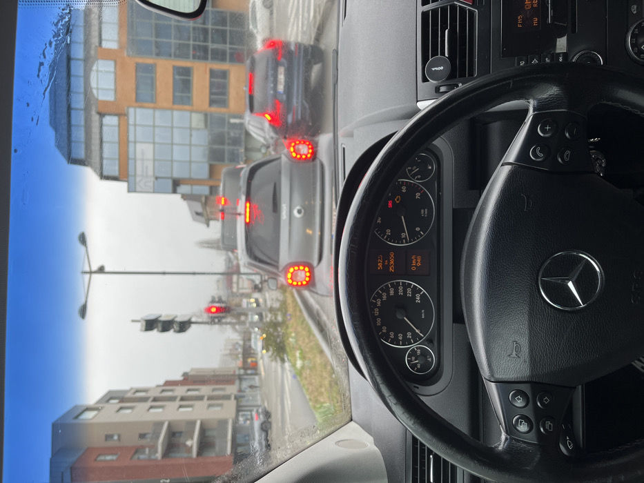 The image depicts an urban street scene in Schaerbeek - Schaarbeek, Belgium, specifically on Avenue Rogier / Rogierlaan looking southeast towards the intersection with Rue Colonel Bourg / Kolonel Bourgstraat. The perspective is from inside a stationary dark-colored Mercedes-Benz passenger vehicle, indicated by the steering wheel with the Mercedes logo, the dashboard, and parts of the car's interior visible in the foreground. The dashboard instrument cluster shows a total odometer reading of 253,650 km, a trip meter of 582.5 km, a speed of 0 km/h, and a time of 9:48. Warning lights for SRS (Supplemental Restraint System) and a check engine light are illuminated. A magnetic phone mount is attached to an air vent on the right. Outside the windshield, the street appears wet under an overcast sky. Traffic is stopped at a red light. Directly ahead of the Mercedes-Benz is a grey Smart Forfour (third generation) with its distinctive circular LED brake lights illuminated. Behind the Smart car, a dark blue Volvo XC60 (second generation) is also visible with its brake lights illuminated. Other vehicles are present further down the road. The road features a median strip with sparse vegetation. A tall streetlight with a double cross-arm design stands near the traffic lights. On the left side of the street, a modern multi-story residential building with grey and reddish-brown facade panels and balconies is visible. At least one pedestrian can be seen on the sidewalk in front of this building. On the right side of the street, a multi-story commercial building features an orange or reddish-brown lower facade and extensive glass curtain walls on its upper floors, reflecting the cloudy sky.