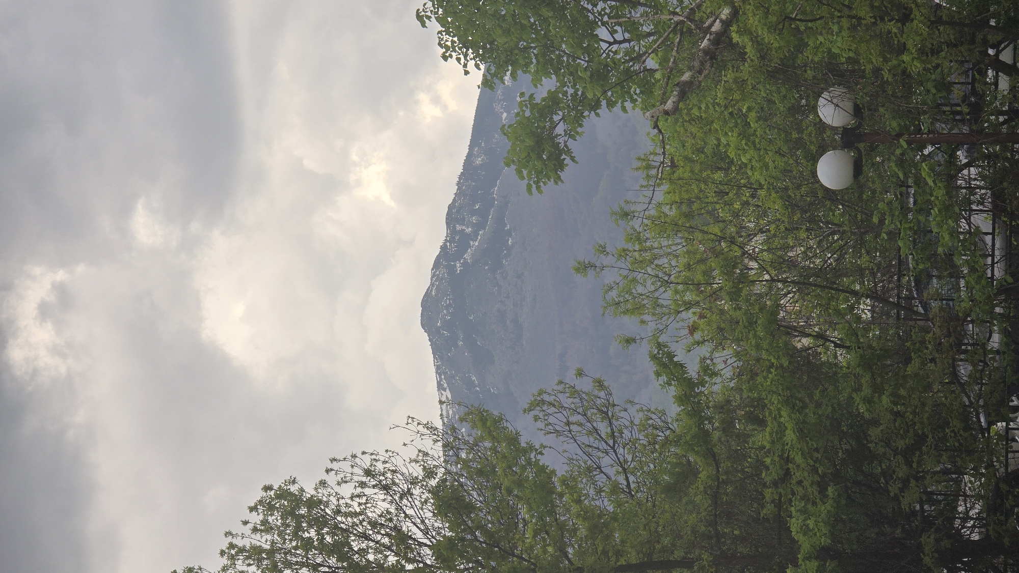 The image captures a mountainous landscape framed by trees, a lamppost, and an overcast sky