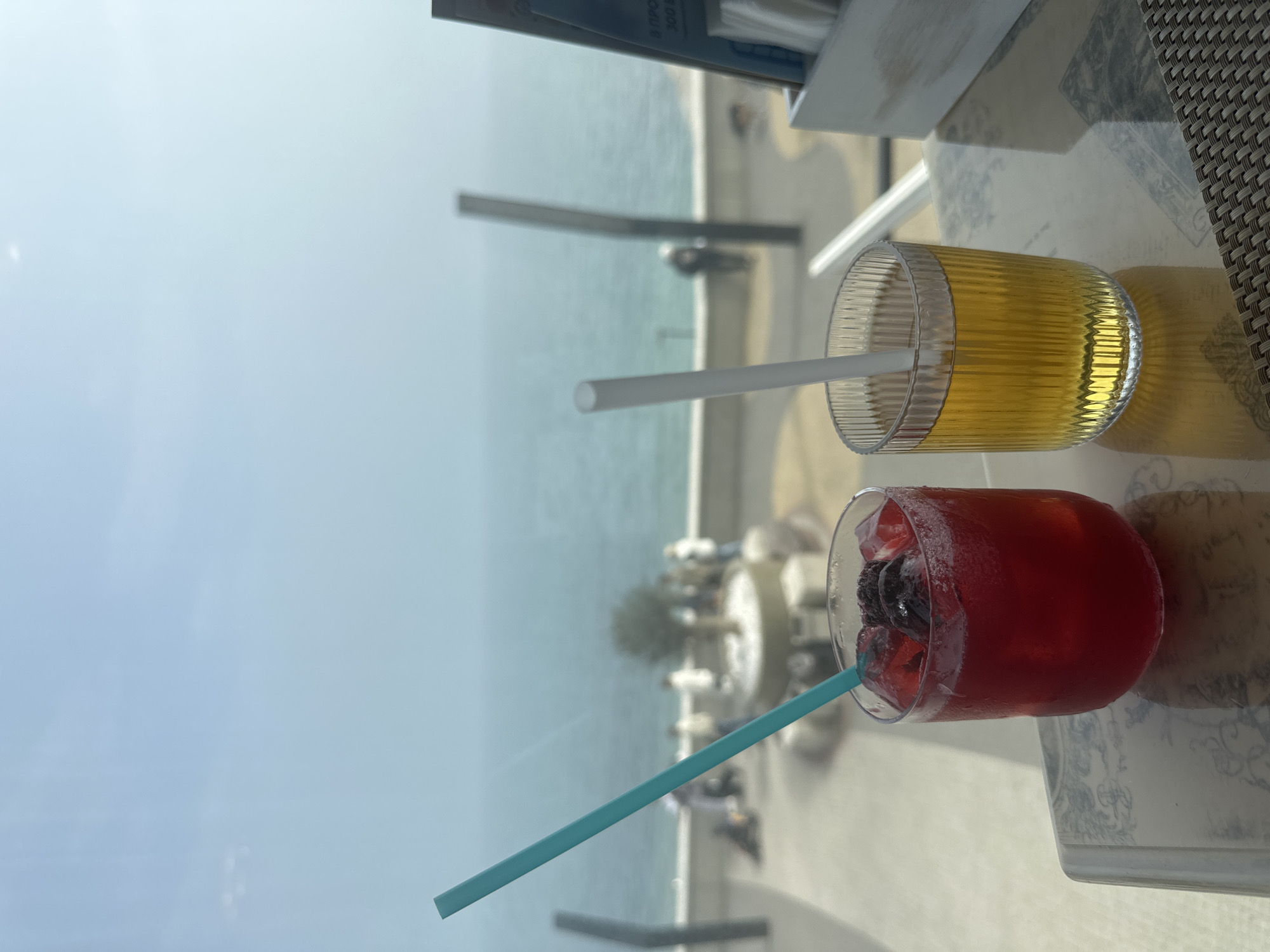 Here is a forensic description of the image: The image shows two beverages in glasses on a table, with a view of the sea and the city of Novorossiysk, Russia in the background. The beverage on the right is yellow and has a white straw. The beverage on the left is red and contains ice and a few dark berries; it has a blue straw. In the background is the coast and shoreline of the city, with buildings and a beach visible. The table has a white patterned surface and a portion with a woven texture. The sky is bright and clear.