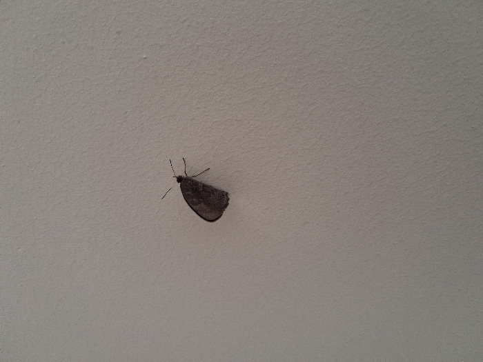 A small, dark grey butterfly or moth is observed stationary, positioned centrally on a uniform, light grey, textured surface. The insect's wings are folded vertically over its back, revealing a slightly granular or dusty texture. Two slender antennae extend forward from its head, and its legs are visible, maintaining contact with the surface. The background consists solely of the aforementioned light grey textured plane, devoid of other objects, individuals, or discernible actions. The scene is located in Takum, Nigeria.