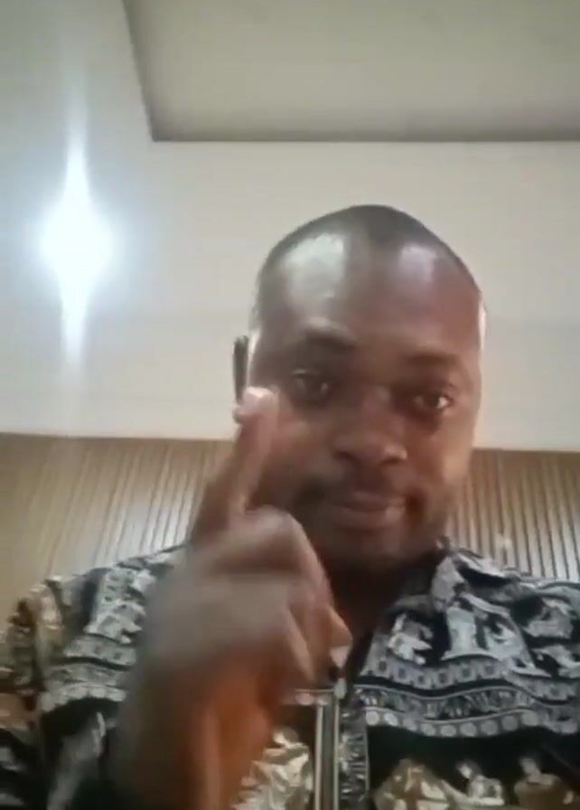 A close-up shot shows a man with a bald head, fair skin, and a patterned shirt. He is holding his index finger up, pointing towards the camera. The background consists of a white ceiling with a rectangular light fixture and vertical wood paneling. The man is looking at the camera, and his expression is neutral. The camera angle is slightly tilted upwards.