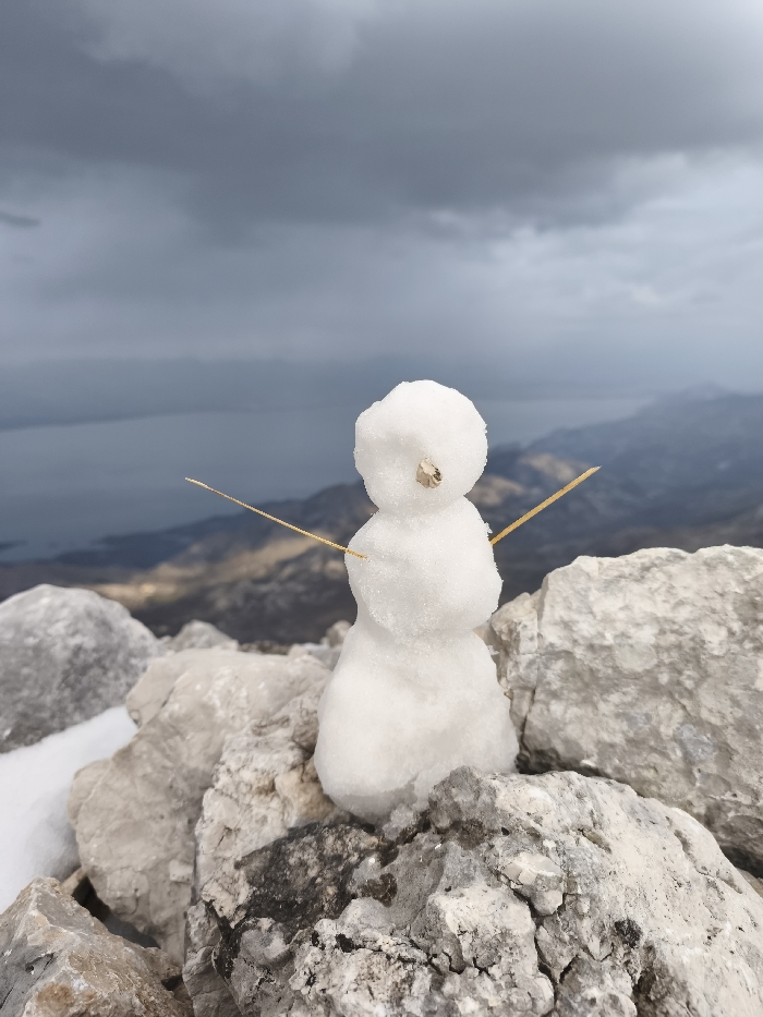 In Mali Mikulići, Montenegro, a small, three-tiered snowman stands on a pile of diverse light-colored rocks in the foreground. The snowman, composed of stacked snowballs, features a single light-toned object as a facial element on its topmost sphere, and two thin, golden-brown linear elements protrude horizontally from its middle sphere, simulating arms. Patches of natural snow are visible on some of the rocks to the left of the snowman. In the midground, a vast body of dark water, likely a bay or lake, is visible below distant, rugged mountain ranges that recede into the horizon. The background is dominated by a heavily overcast sky with dense, dark grey clouds. The scene is illuminated by diffused natural light, indicative of a cloudy day.