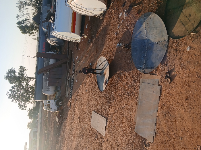 A yard landscape with a mix of metallic satellite dishes, and flat rectangular metal pieces scattered across a reddish-brown dirt surface. A person is visible near a reflective dish. Trucks and a metal structure sit in the background, partially obscured by a tree. The lighting suggests either early morning or late afternoon.