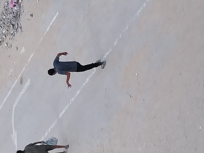 The image depicts an outdoor scene in Khan Yunis, Palestinian Territory, captured from an elevated perspective looking down onto a light-colored road surface. On the left, an individual walks away from the camera, wearing a dark short-sleeved top, dark shorts, and sandals, carrying a light-colored plastic bag in the left hand. Towards the center-right, another individual, seen from behind, wears a dark grey t-shirt, dark trousers, and sneakers. This person is captured mid-movement, with both arms bent at the elbows and hands open, fingers splayed. White dashed lines, consistent with road markings, traverse the surface, with a curved white line also visible in the upper left. In the upper right, a pile of rubble and debris, including a small pink object, lies on the ground. Scattered small dark specks, light fragments, and a thin, dark, curved object are visible on the road surface.