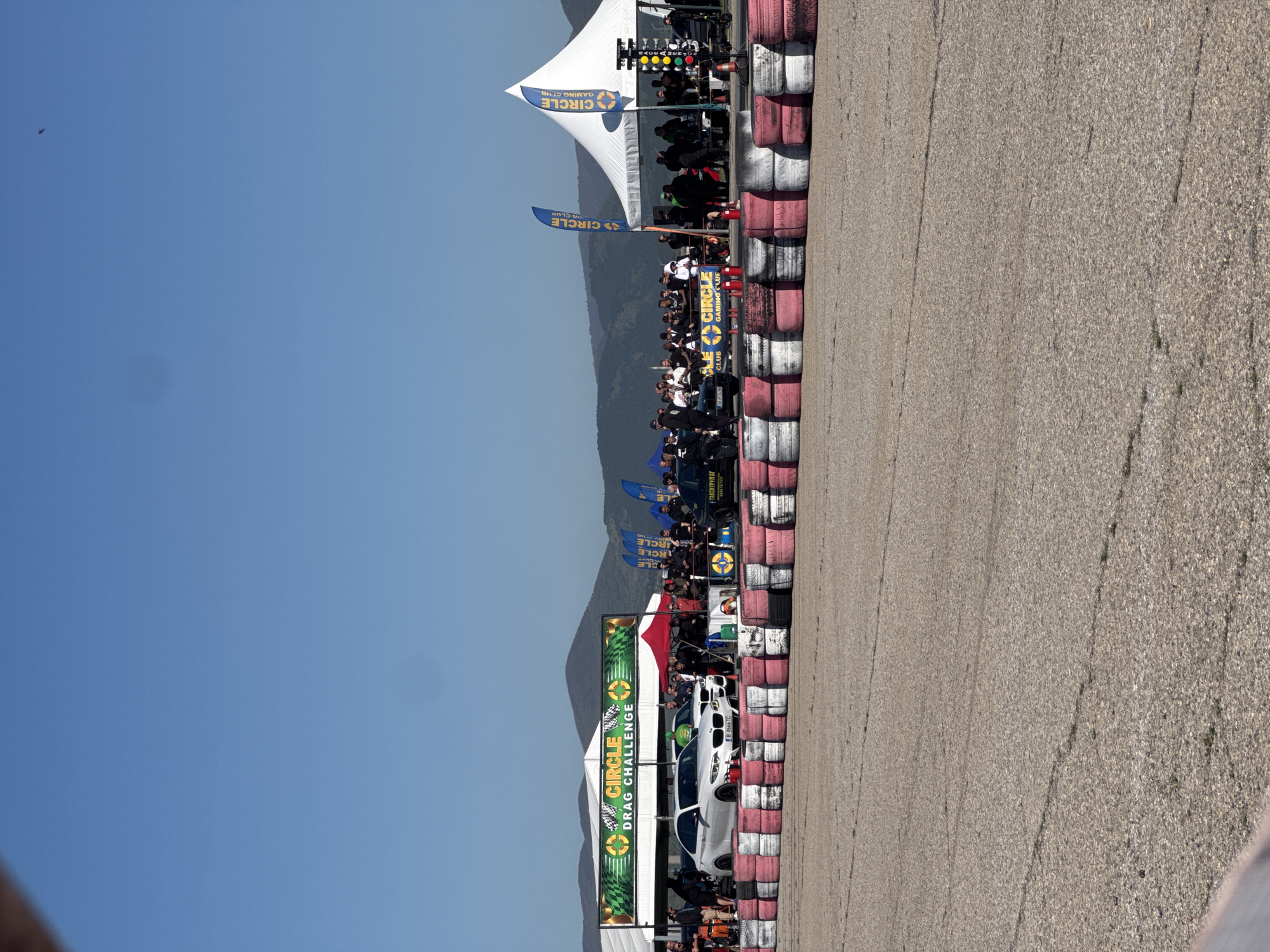 The image depicts a drag racing event at a race track