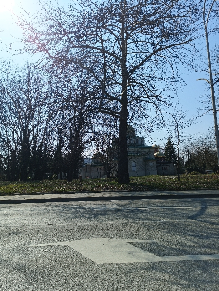 The scene depicts a street view in Burgas, Bulgaria, with the "Sveti Ivan Rilski" (Saint Ivan Rilski) Orthodox Church visible in the background. The vantage point is from a paved road, likely "Bulgaria" Boulevard, looking towards the church situated on the edge of the Sea Garden park area. In the foreground, an asphalt road surface occupies the lower half of the frame. A large, white painted arrow, indicating a turn or directional guidance, is centered on the road surface, pointing generally left. Dark shadows from overhead trees and possibly utility poles are cast across the asphalt. The midground features a concrete curb separating the road from a narrow, gray concrete sidewalk. Beyond the sidewalk is a strip of ground covered with sparse grass and scattered dry, brown leaves, indicative of autumn or winter. Several deciduous trees, mostly bare of foliage, rise from this area. A large, prominent bare tree trunk and branches dominate the center-right midground. In the background, the "Sveti Ivan Rilski" Orthodox Church is clearly visible. The church structure is light-colored, featuring a large, central green dome and several smaller golden cupolas. Other bare trees flank and partially obscure the church. A utility pole or street light standard is present on the far right edge of the frame. The sky is clear and bright blue, with significant sunlight causing lens flare in the upper left quadrant of the image. No individuals or specific actions are discernible within the frame.