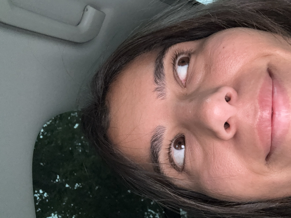 The image displays a close-up, upward-angled shot of a female individual's face within a vehicle. Her forehead, eyes, nose, and mouth are visible. She has medium skin tone, dark brown eyes with dark, thick eyebrows, and dark brown hair framing her face. Her eyes are directed upward and divergently, looking towards her left and right. Her lips are slightly upturned in a subtle smile. The background reveals a grey vehicle headliner, with a blurred view of dark green tree foliage visible through a window on the upper left. A light-colored plastic component, possibly a sun visor clip or grab handle, is present on the upper right of the headliner. The scene is located in Princeton, United States; however, the precise point within the city is not discernible from the visual information.