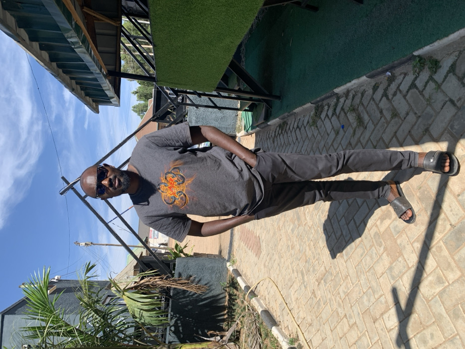 An adult male stands center-frame on a brick-paved path under bright sunlight, located in Gura Top, Nigeria